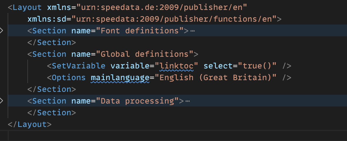 The Section support is part of the new vscode-speedata extension, which replaces the older RedHat XML mode. Besides sections, it brings proper syntax support, validation, and autocomplete for the speedata Publisher layout language. If you use VS Code for editing your layouts, it is worth installing.